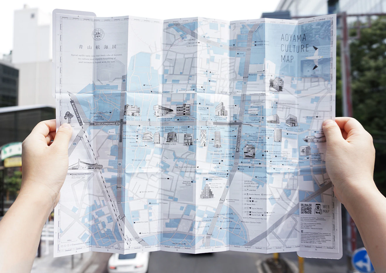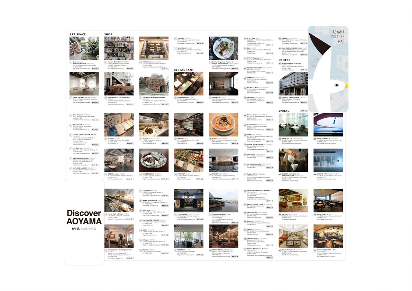 また、スパイラル内のクリエイティブマーケット「MINA-TO」にて配布されている『SPIRAL AOYAMA CULTURE MAP』のアートディレクションおよびデザインも担当。ヒト・モノ・コトが自由に行き交う文化の“港”というコンセプトのもと、青山エリアを俯瞰する海図として設計した。