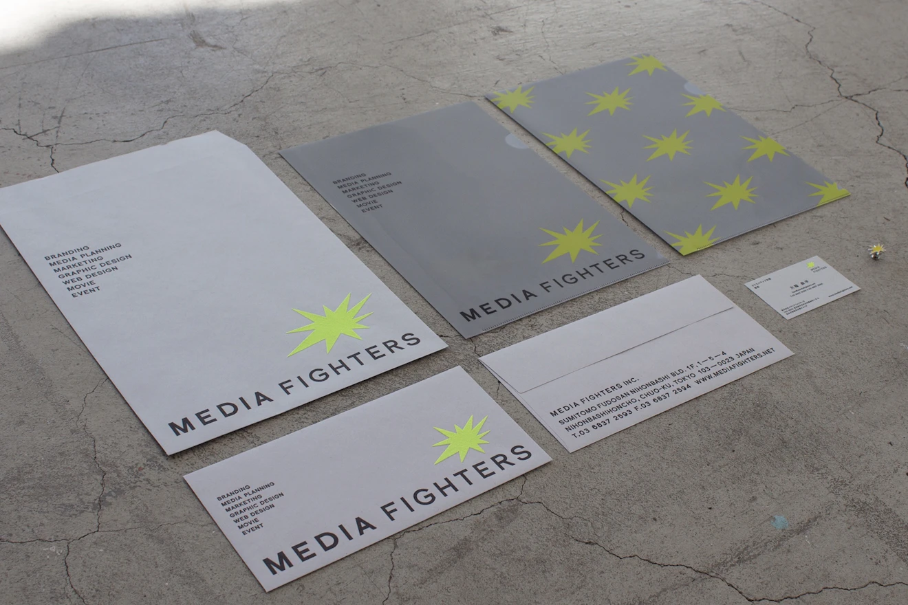 MEDIA FIGHTERSのロゴおよび会社ツールのデザインを担当。ロゴは、ファイターによる「衝撃」と、瞬間的に走る「閃き」をモチーフに設計。鋭く広がるフォルムによってエネルギーの放出やスピード感を視覚化し、ブランドの持つ攻めの姿勢と発想力を象徴的に表現している。印刷では、ロゴマークに光のニュアンスを持たせるため、蛍光色を採用。さらに発色の良い発泡印刷を用いることで、視覚的なインパクトに加え、独特の手触りを持つ仕上がりとした。グラフィックとしての強さと、触覚的な体験の両面から、記憶に残るビジュアルを目指した。