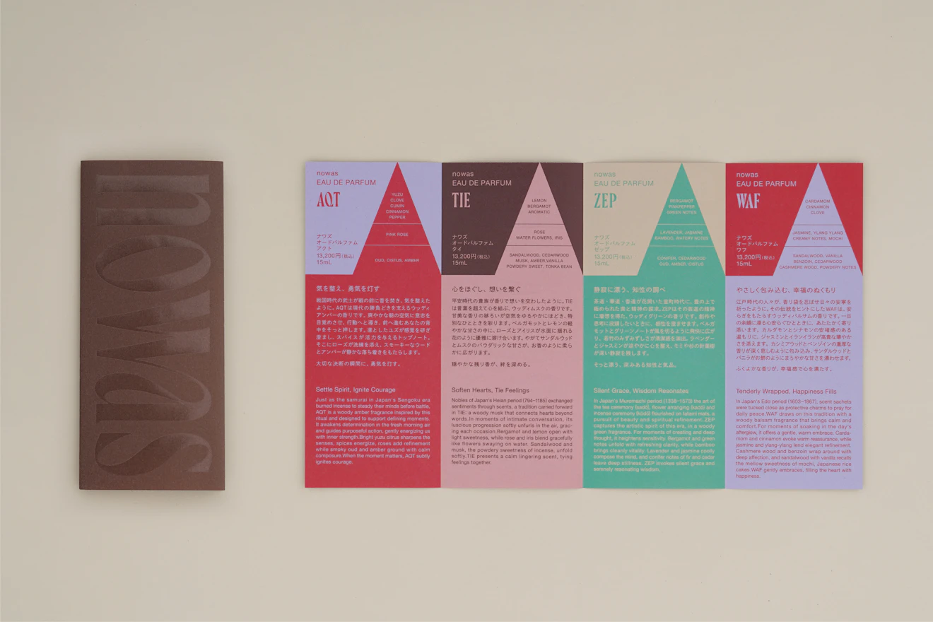 “和”で時を結び、伝統を現代へと受け継ぐ香りのお守り。nowasは、今(NOW)と過去(WAS)を、和(WA)の精神でつなぐフレグランスブランド。日本香堂グループが450年にわたり育んできた香りの文化と美意識を、現代のライフスタイルに継承します。香りは古くから人々に寄り添い、自己表現の手段でした。戦国の武士は兜に香を焚き染めて気を整え、平安の貴族は香りで想いを交わし、室町では芸道の精神を支え、江戸では香り袋がお守りのように親しまれました。4つの香りは、それぞれ異なる時代の精神を表現。伝統とモダンな感性が響き合う香りが、日常を美しく彩ります。木のキャップは、日本香堂が長い年月をかけて育んできた香りの文化や精神性-WAS(過去)を象徴しています。手に伝わる木の温もりが、香りを「身にまとうお守り」と捉えるnowasを体現し、フラットなボトルと印象的な色彩は、NOW(現代)の表現。クラシカルとモダン、静と動。相反する要素が共存することで、「時間の連なり」を視覚化しました。ボトルカラーには時代ごとに宿る精神性と、香りがもたらす“心の状態”を色として投影しました。香りを選ぶことは、その瞬間の自分の在り方を選ぶことだと考えています。
