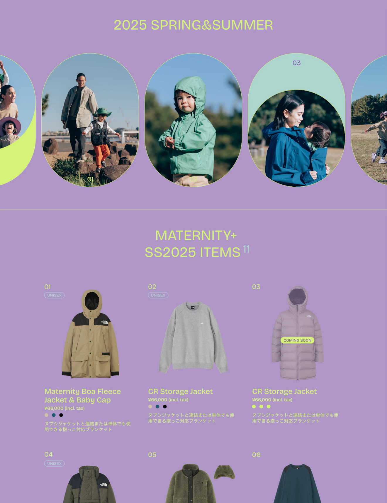 THE NORTH FACE MATERNITY+ 2025 SSのアートディレクションとWEBデザインを担当しました。キッズラインとの掛け合わせにより、家族の広がりと日常のにぎやかさを表現。太陽の光を感じるようなやわらかなトーンの中で、親子が過ごす時間のあたたかさと軽やかさを描いています。キッズおよびベビーウェア特有の豊かなカラーバリエーションを活かし、デザインには明るくエネルギーのあるカラーリングを採用。自然光の中でそれらの色が伸びやかに映えることで、生命力や前向きなムードを視覚的に引き出しました。